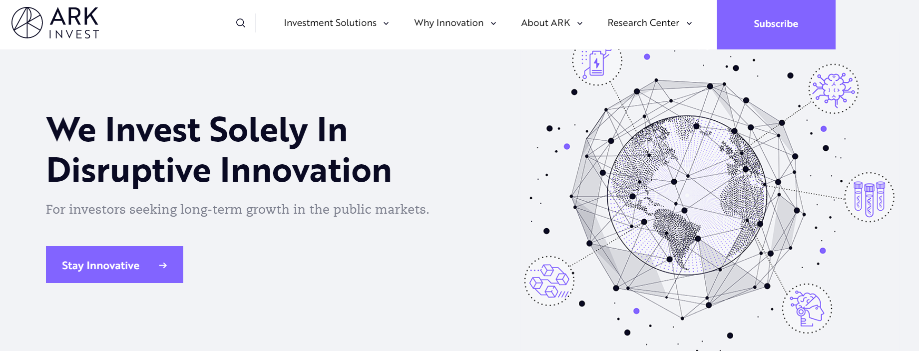 ARK Invest는 파괴적 혁신 기업에 투자하는 투자전문 회사입니다. 홈페이지 첫장부터 그 내용을 확인할 수 있는데요.