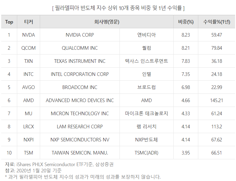 해당 지수의 편입 대상은 미국 주식시장에 상장된 반도체 제조/판매/디자인/장비 등의 종목으로 한정