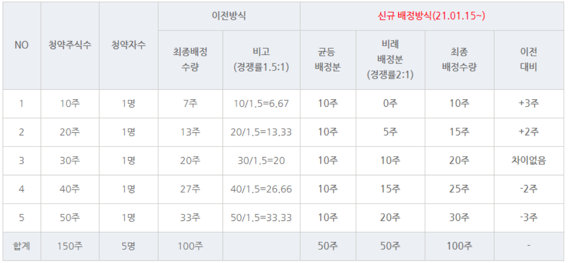 2021년 1월 15일 이후 공모주 청약에 대해 일반청약자 배정방식의 형평성 제고 목적으로 주식 배정방식을 소량의 투자금으로도 청약에 당첨될 수 있도록 변경한 내용.