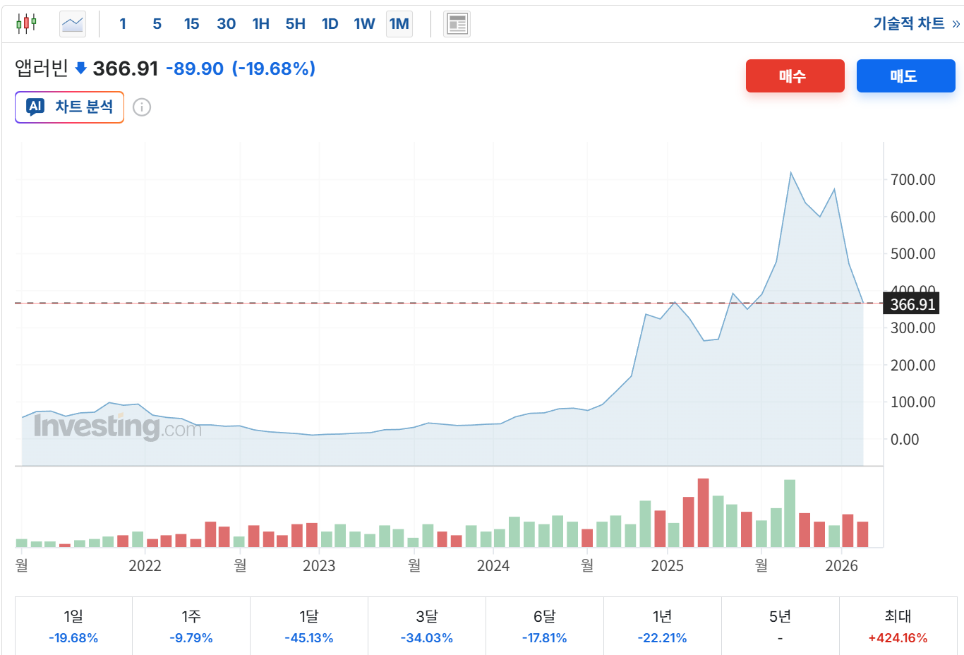 앱러빈의 주가 차트를 보면 마치 롤러코스터를 보는 듯합니다. 단순히 '떨어졌다'는 말로는 부족하고 절반의 지수를 반납할 정도로 급격한 변동성을 보이고 있습니다.