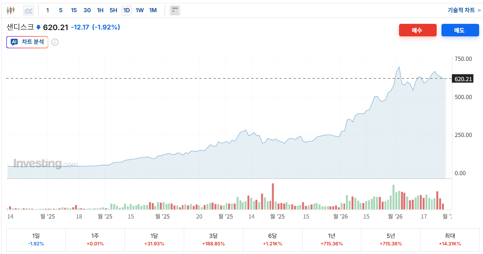 웨스턴디지털/샌디스크는 AI를 리딩하는 미국 기업의 이점과 HBF를 자체 생산하고 있어 최근 1년동안 700%이상의 주가 상승을 이뤄내고 있습니다.